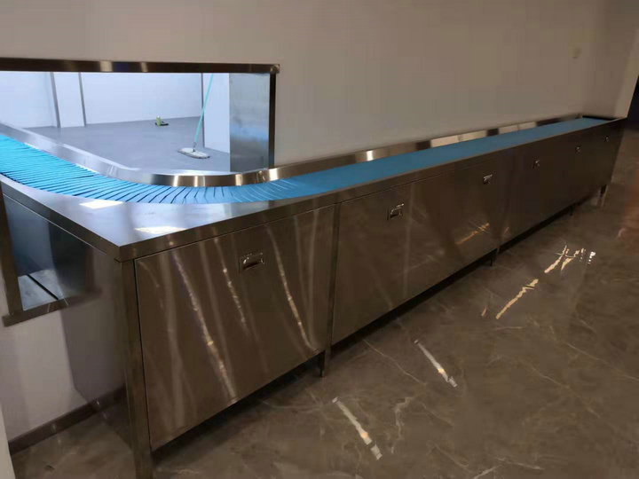 ·傳送鏈板通過不銹鋼鏈條驅(qū)動,帶動碗碟、餐盤等餐具的傳送,提高餐盤回收效率。